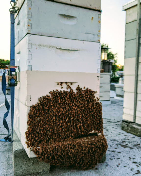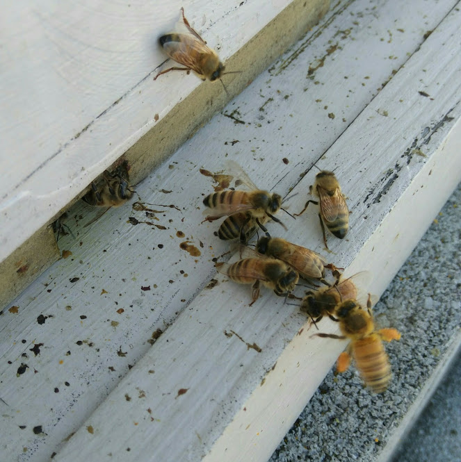 Some of the fanning bees, with their abdomens extended, are fanning Nasanov, the homing pheromone that helps a foraging bee find her way back to her own hive.